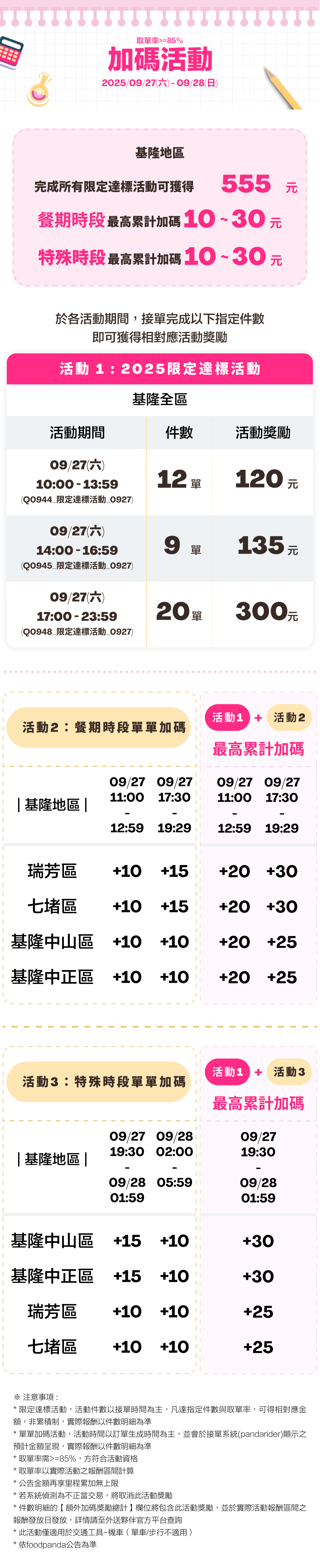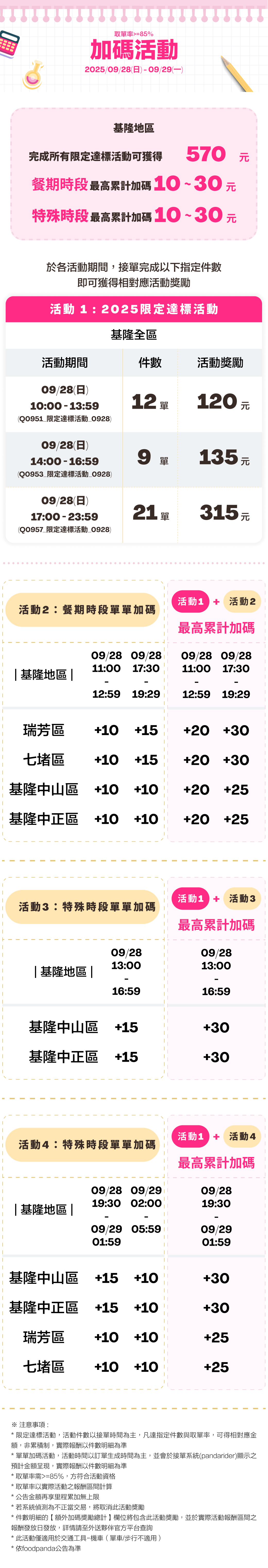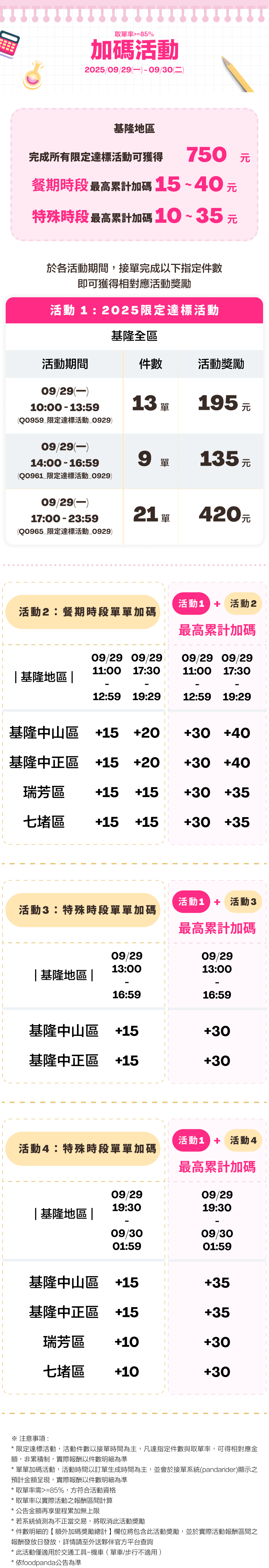 * 餐期單單加碼活動與特殊時段單單加碼活動,活動時間以訂單生成時間為主,並會於接單系統(pandarider)顯示之預計金額呈現,實際報酬以件數明細為準