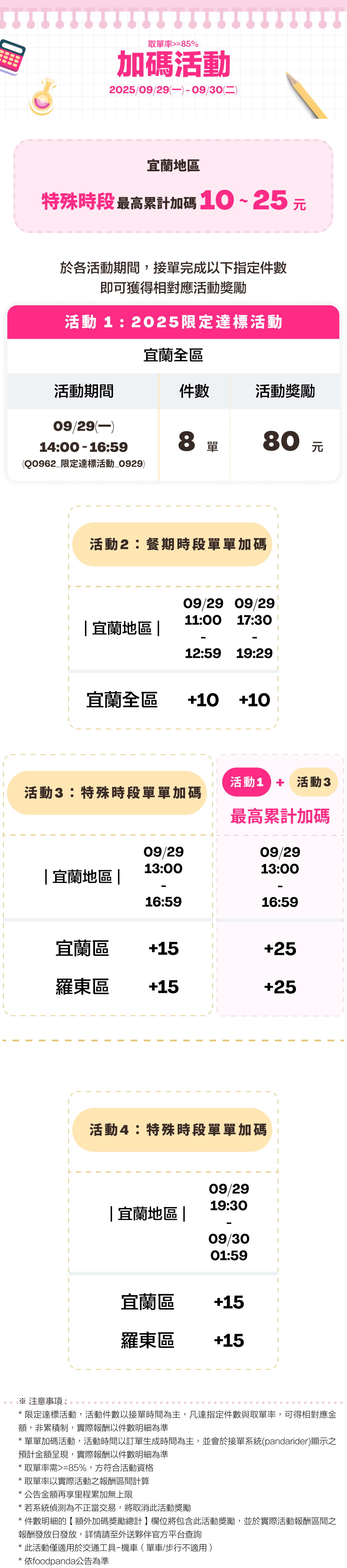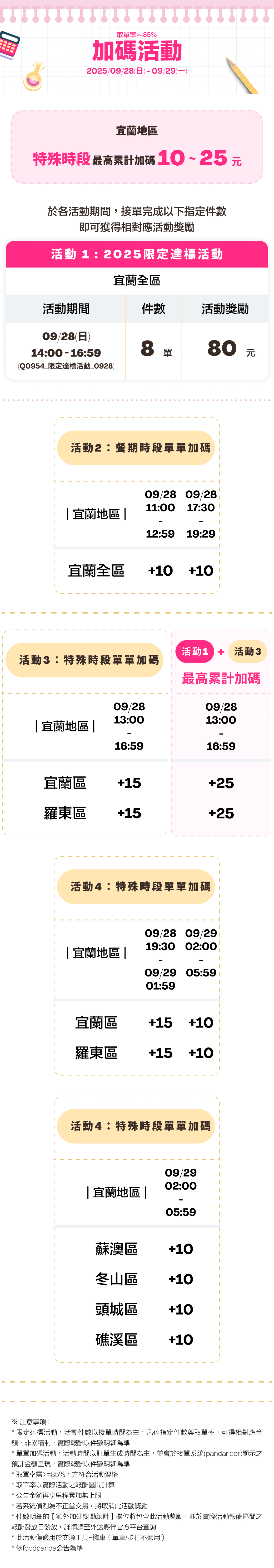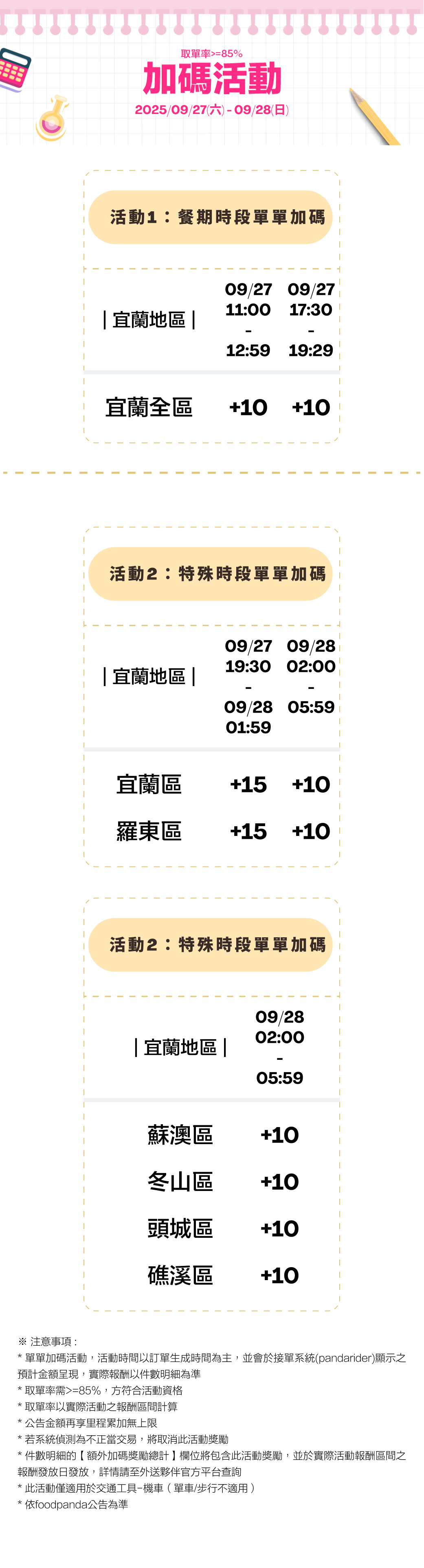 * 餐期單單加碼活動與特殊時段單單加碼活動,活動時間以訂單生成時間為主,並會於接單系統(pandarider)顯示之預計金額呈現,實際報酬以件數明細為準