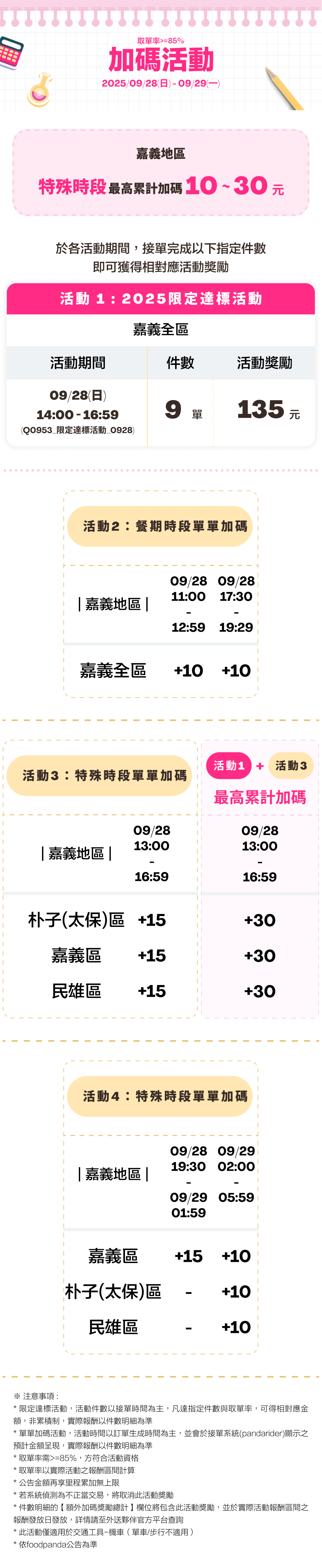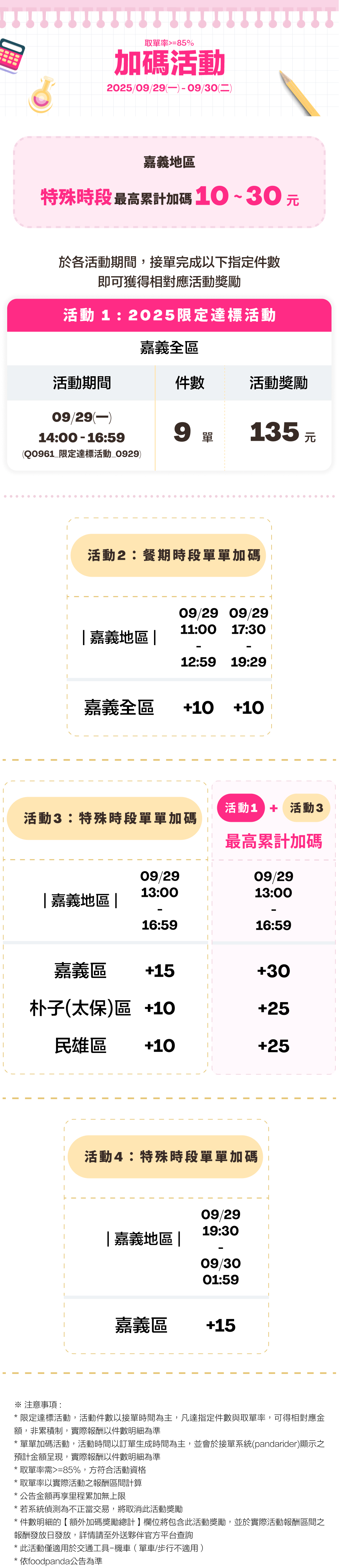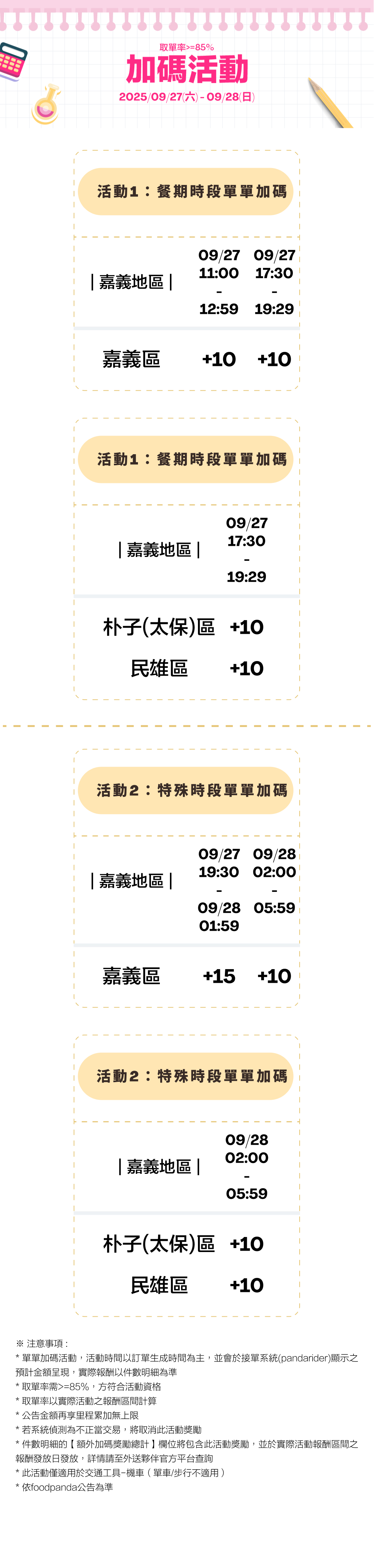 * 餐期單單加碼活動與特殊時段單單加碼活動,活動時間以訂單生成時間為主,並會於接單系統(pandarider)顯示之預計金額呈現,實際報酬以件數明細為準