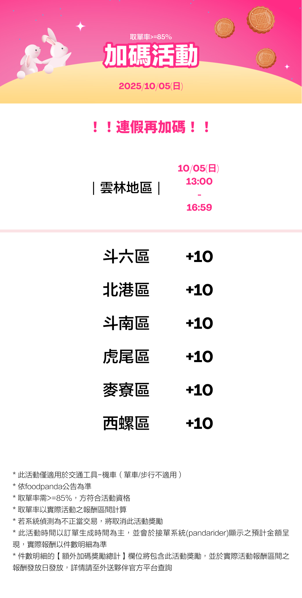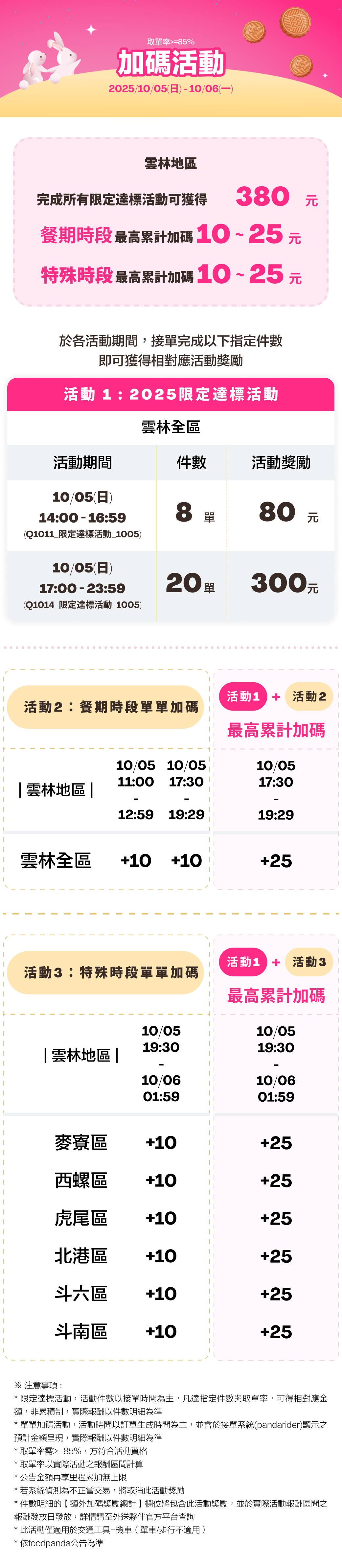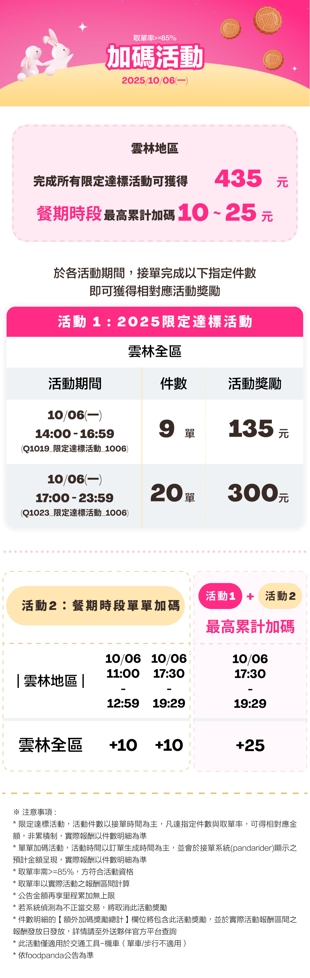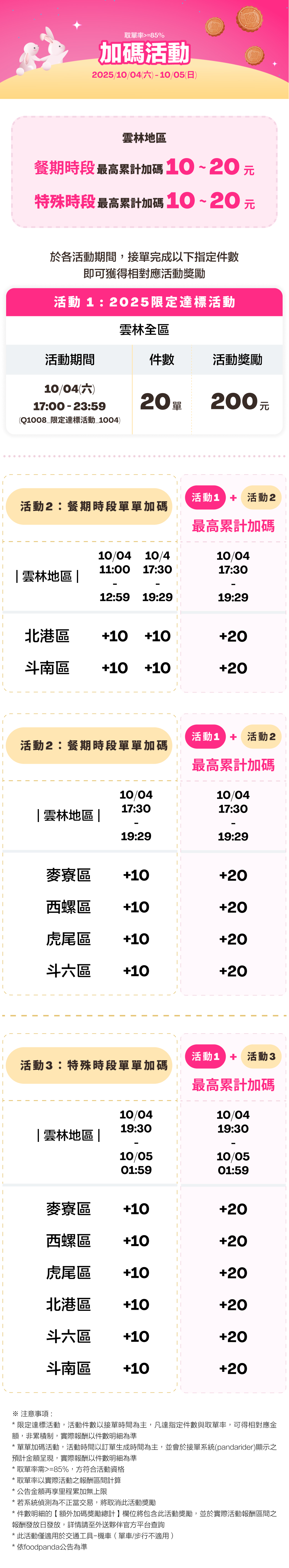 * 餐期單單加碼活動與特殊時段單單加碼活動,活動時間以訂單生成時間為主,並會於接單系統(pandarider)顯示之預計金額呈現,實際報酬以件數明細為準