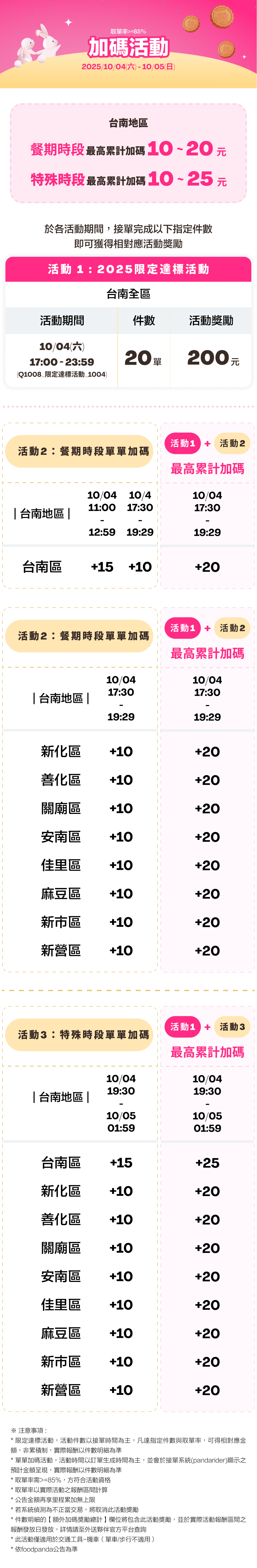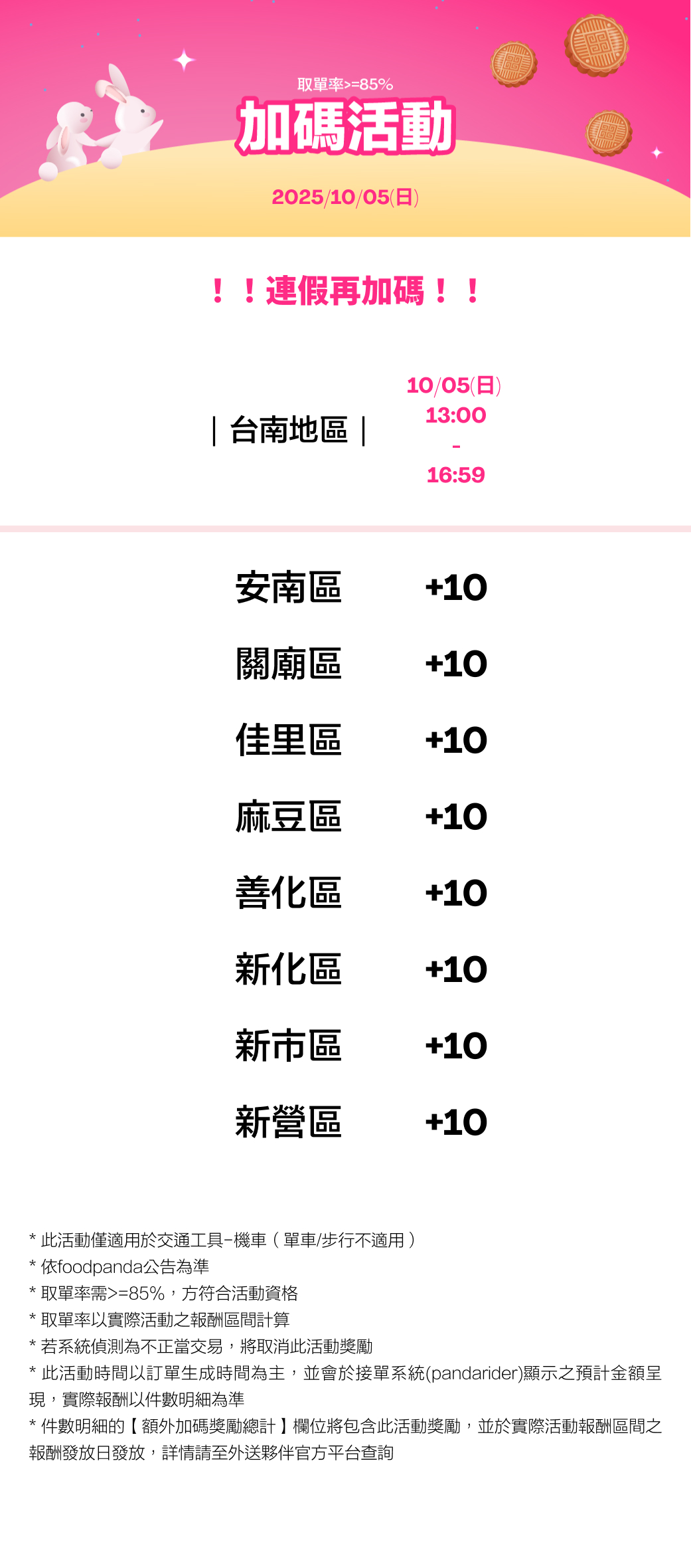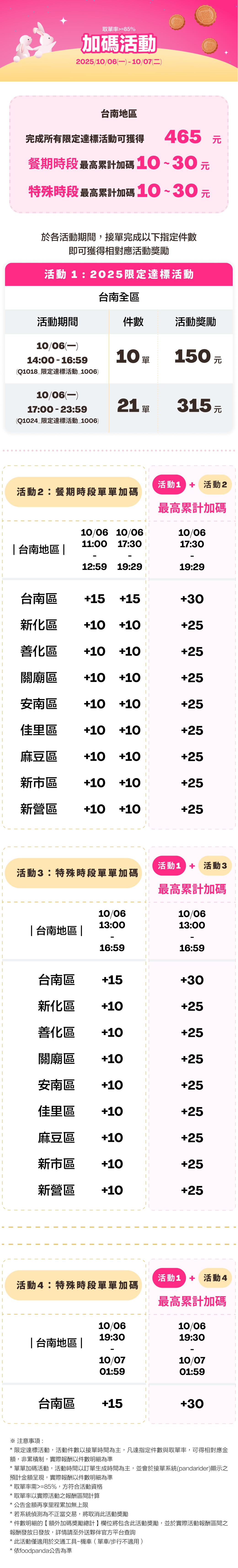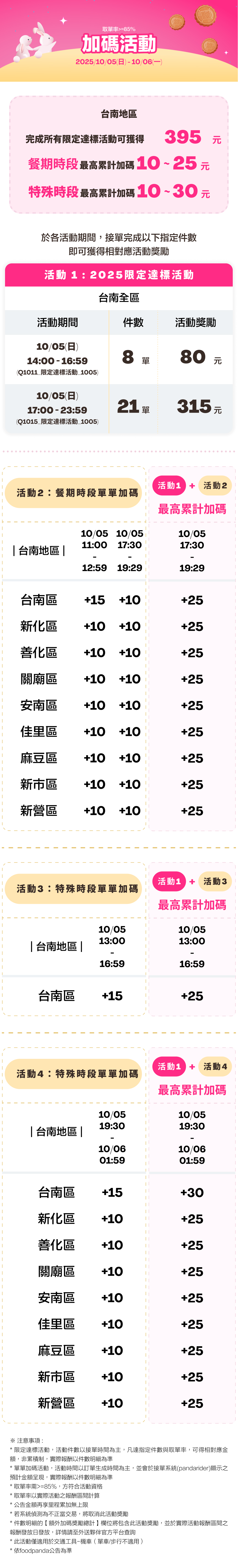 * 餐期單單加碼活動與特殊時段單單加碼活動,活動時間以訂單生成時間為主,並會於接單系統(pandarider)顯示之預計金額呈現,實際報酬以件數明細為準