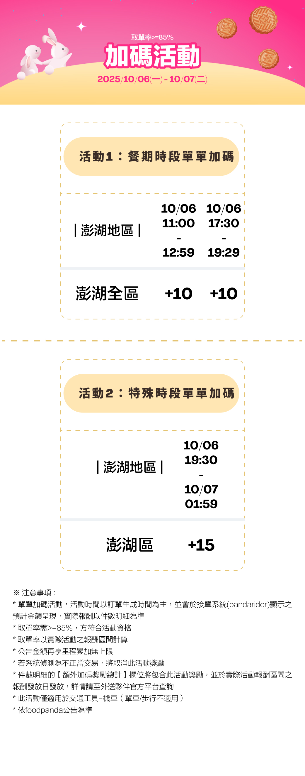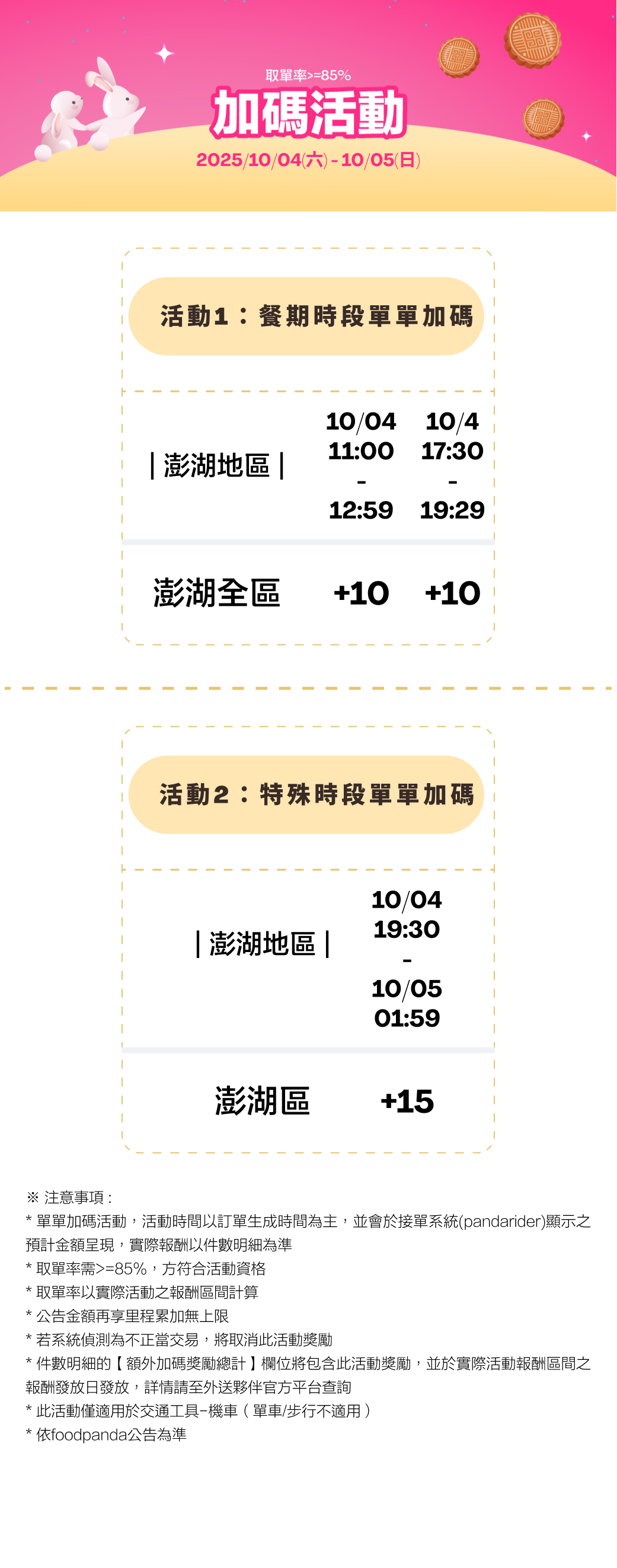 * 餐期單單加碼活動與特殊時段單單加碼活動,活動時間以訂單生成時間為主,並會於接單系統(pandarider)顯示之預計金額呈現,實際報酬以件數明細為準