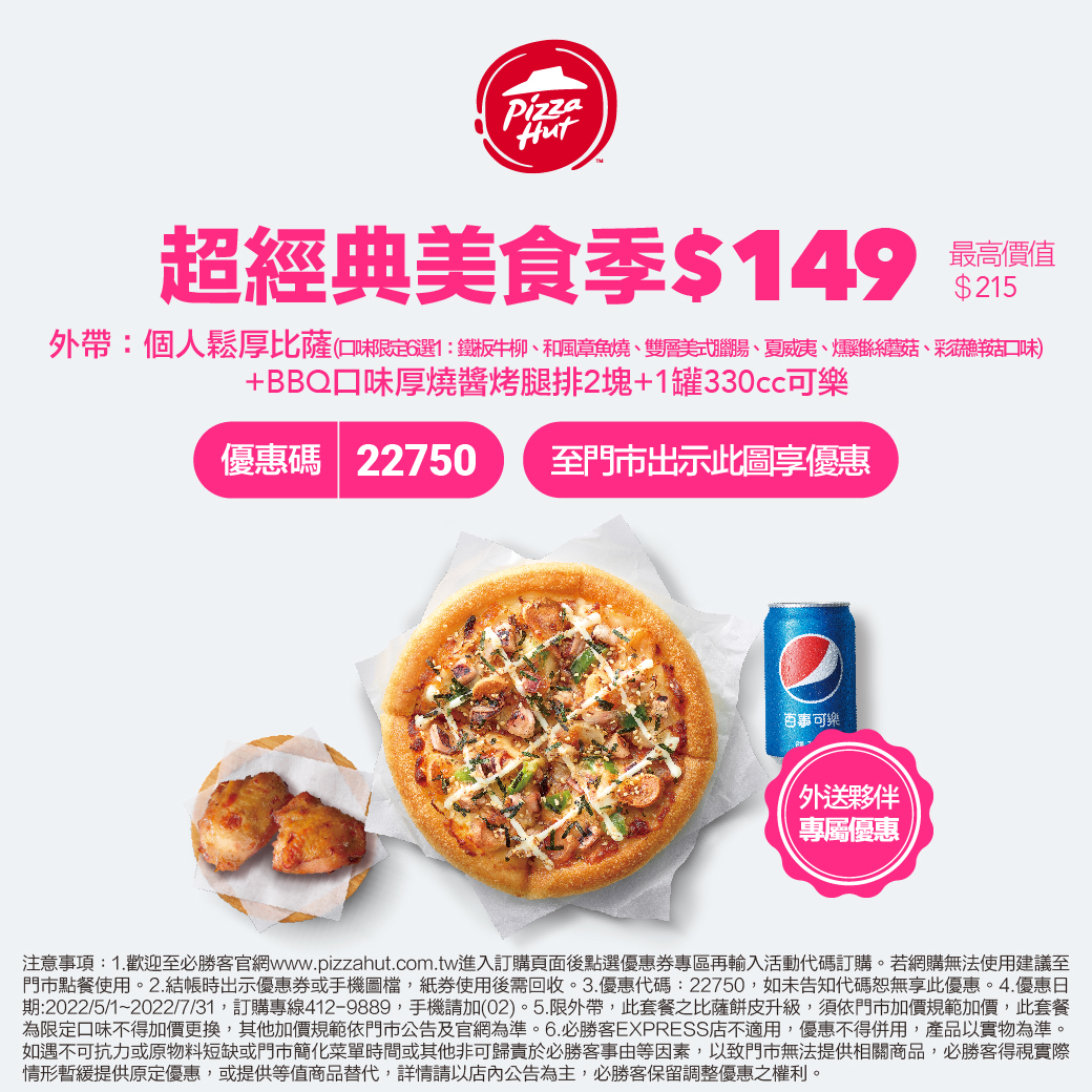 6.必勝客EXPRESS店不適用,優惠不得併用,產品以實物為準。如遇不可抗力或原物料短缺或門市簡化菜單時間或其他非可歸責於必勝客事由等因素,以致門市無法提供相關商品,必勝客得視實際情形暫緩提供原定優惠,或提供等值商品替代,詳情請以店內公告為主,必勝客保留調整優惠之權利。