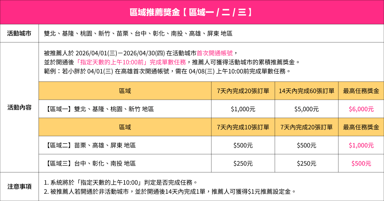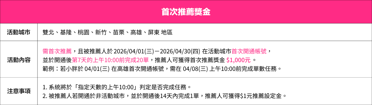 每月推薦開通名額有限,若當月名額已滿,foodpanda保留停止開通之權利,並於官方平台公告,被推薦人將順延至下一期開通,不需重新申請。