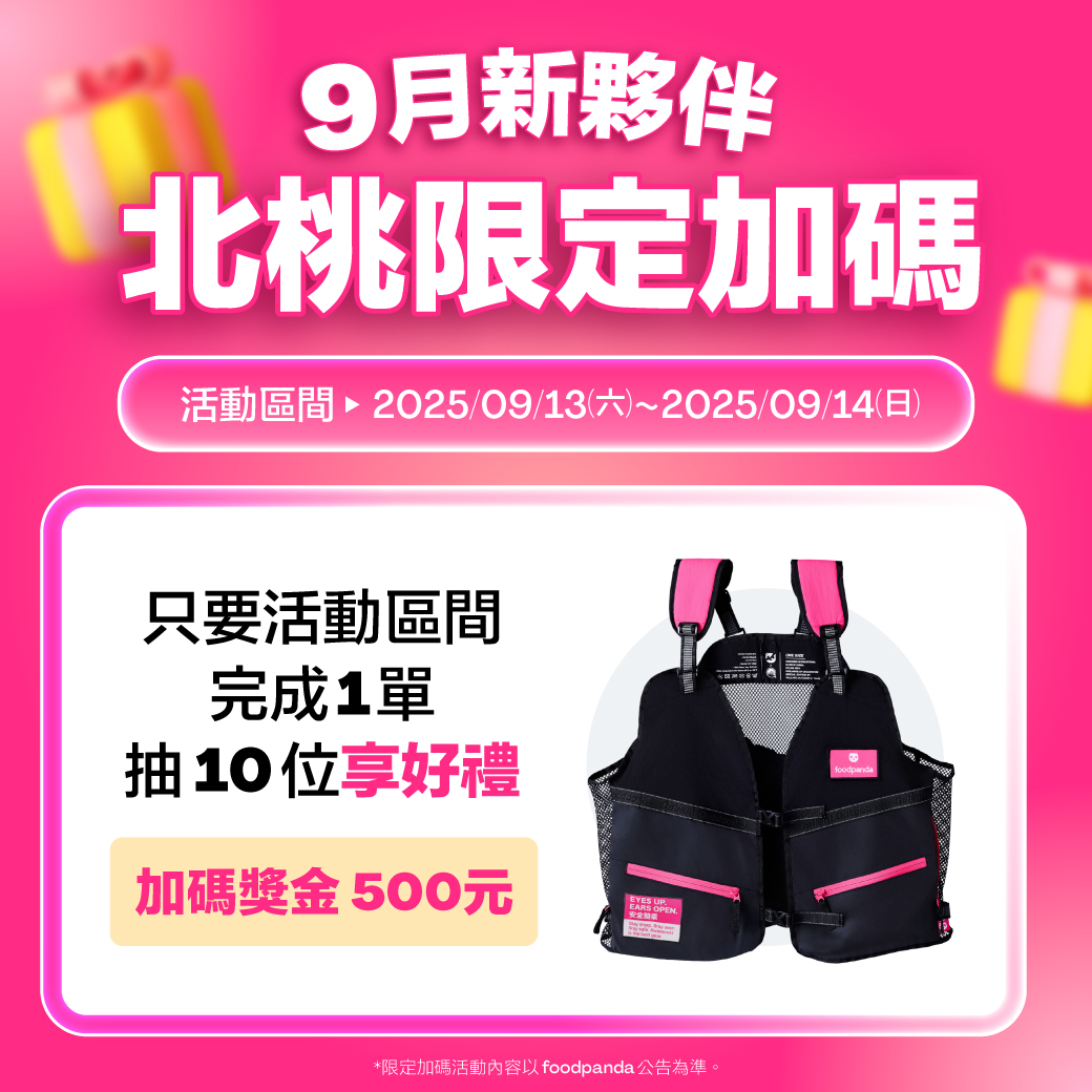 ※「foodpanda x Gallant Outdoor 品牌機能背心」配送時間約2~3個工作天,敬請耐心等候! - 活動獎金大方送:週末加碼抽之中獎者於10/03(五)前完成下述任務,還可以再拿活動獎金$500元!