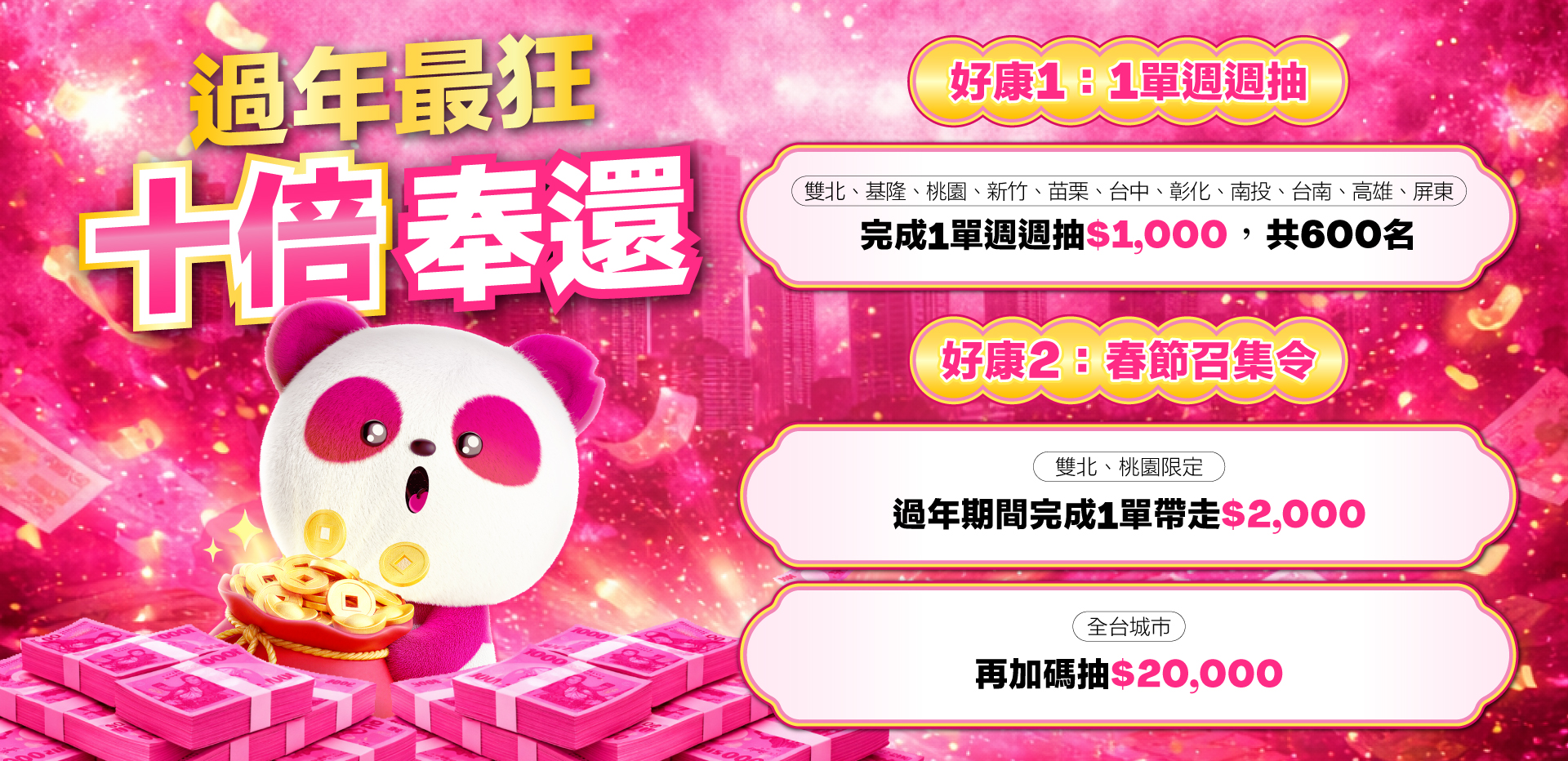 - 再加碼抽 $20,000元|完成 1 單即可抽,跑越多天機會越高