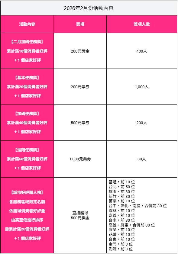 - 活動內容:依2月活動結算累積消費者好評數量,由高至低進行排序,各服務區域限定名額,需解鎖 20 個消費者好評 + 1 個店家好評