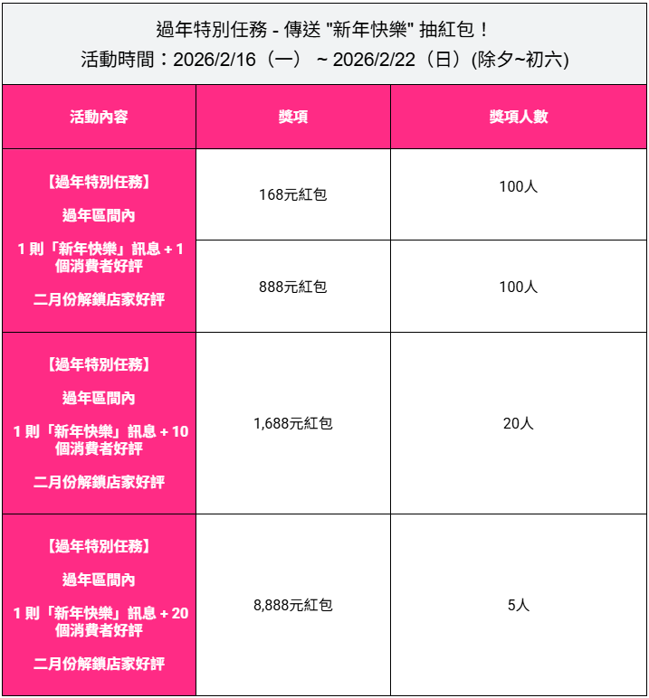 - 活動時間:2026/2/16(一) ~ 2026/2/22(日)