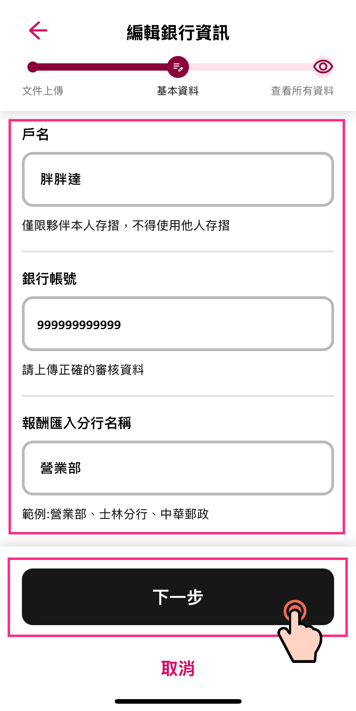 Step 4: 編輯銀行資訊後,點擊【下一步】