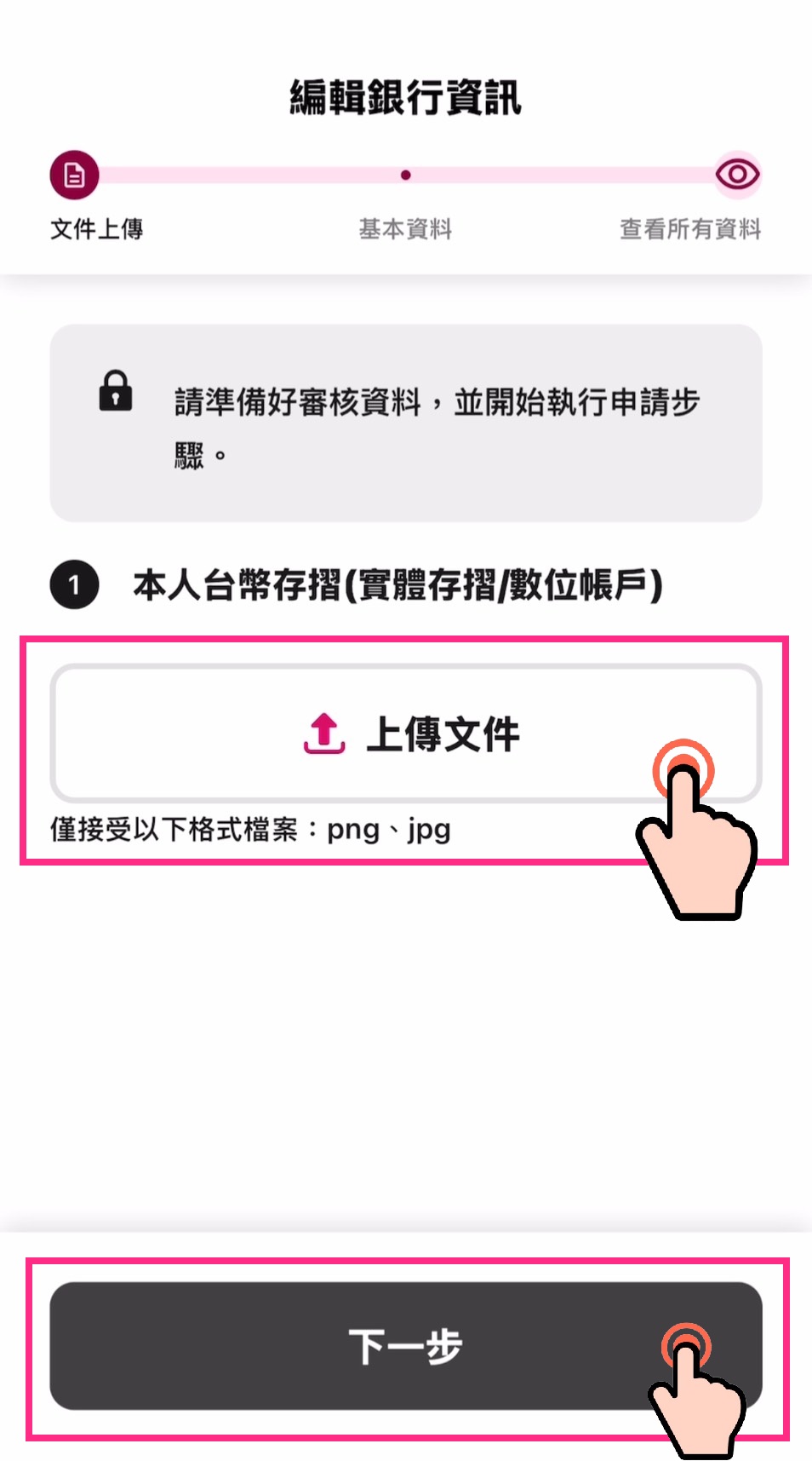 Step 3: 點擊【編輯銀行資訊】並點擊【上傳文件】,上傳完畢後點擊【下一步】